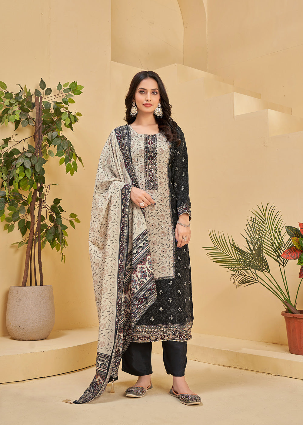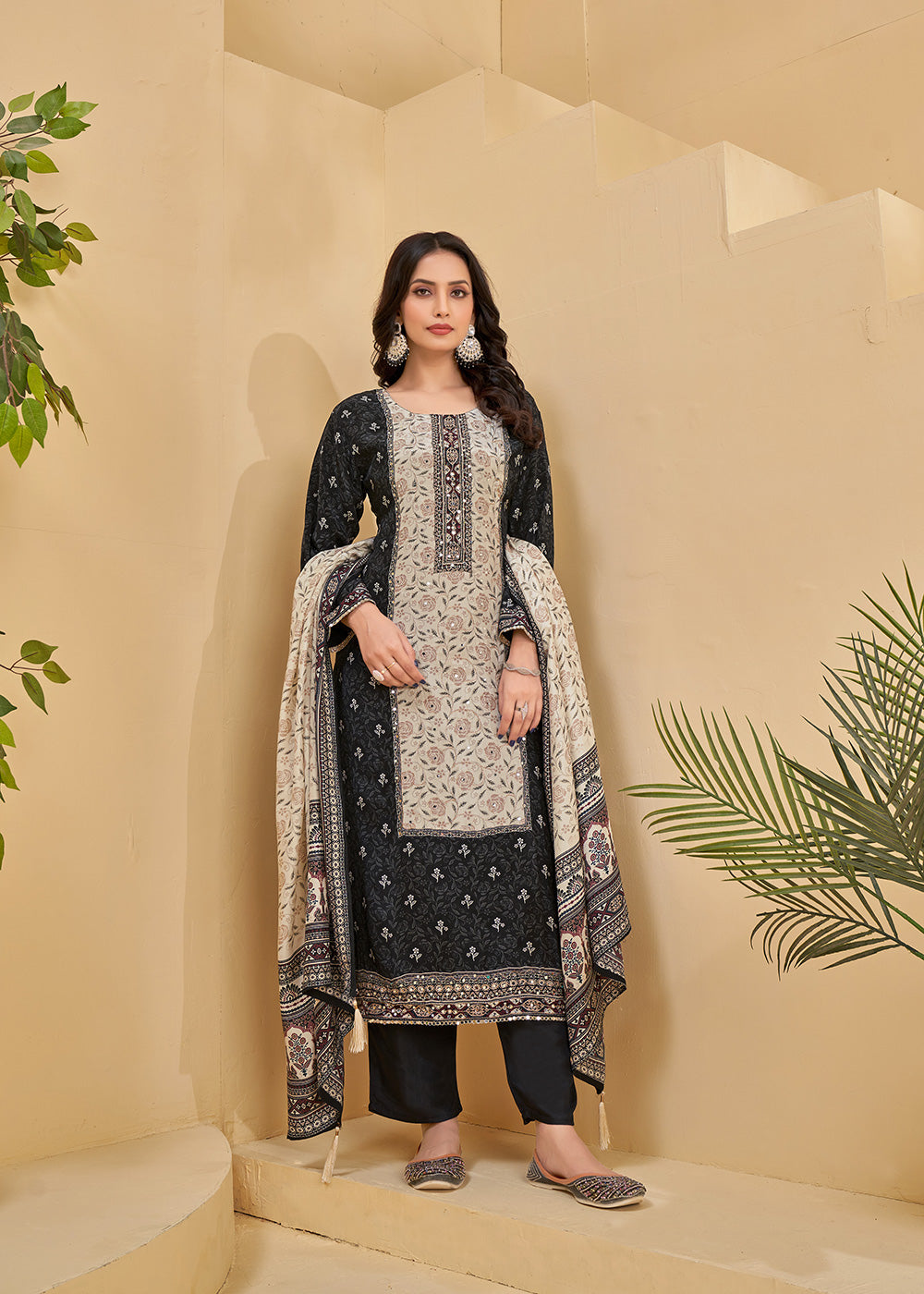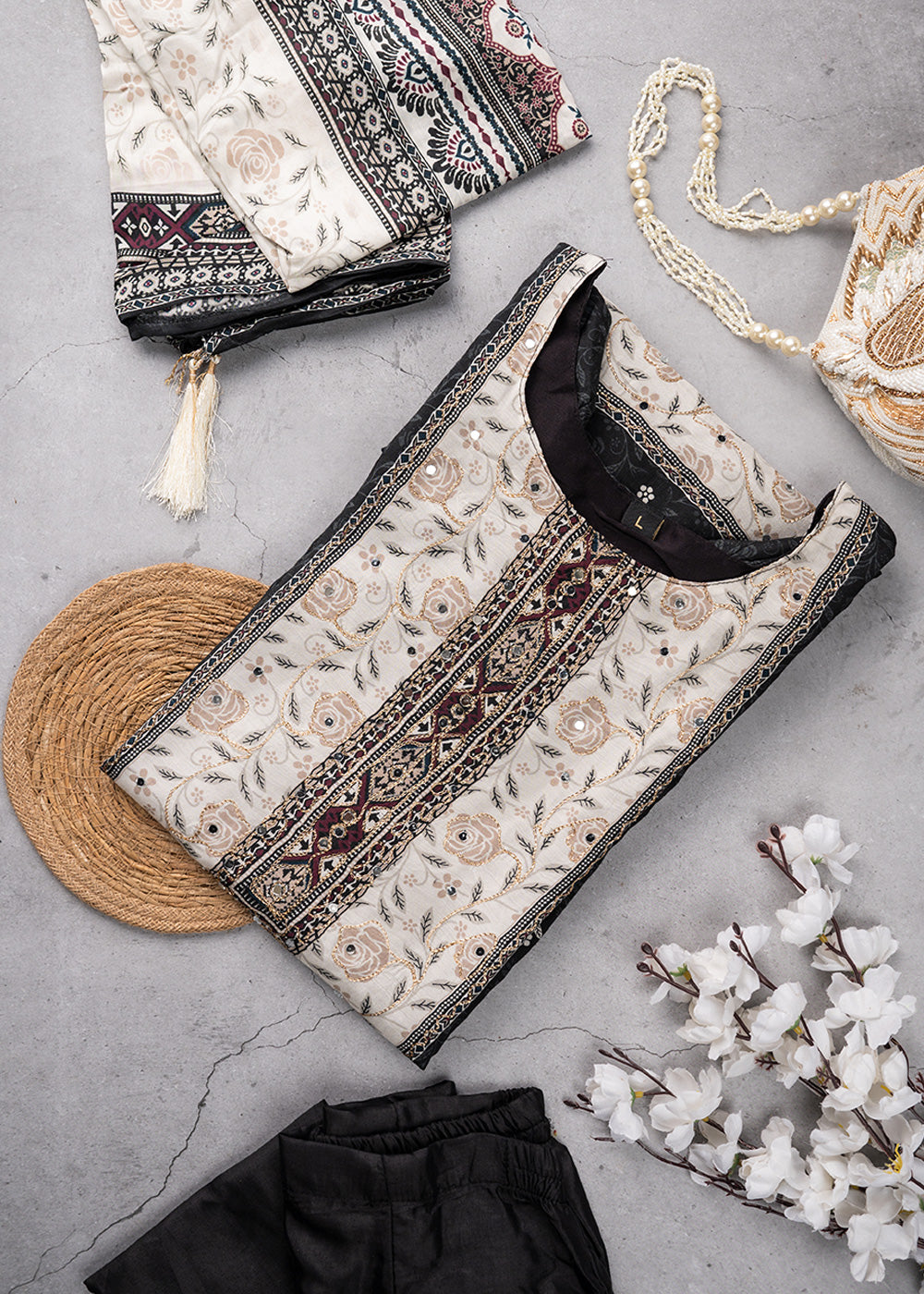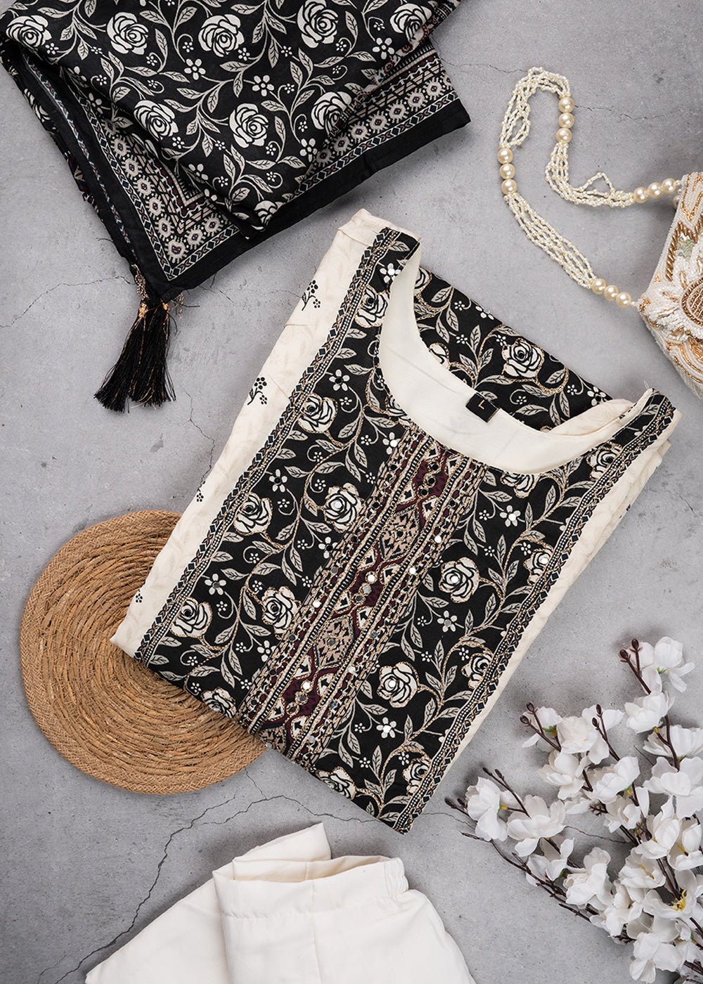 - 3 piece suit for party wear in the color Black with Digital print work and additional hand and mirror work.