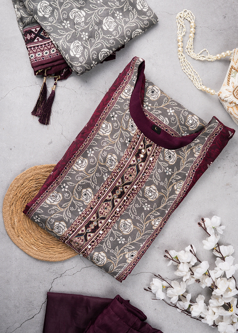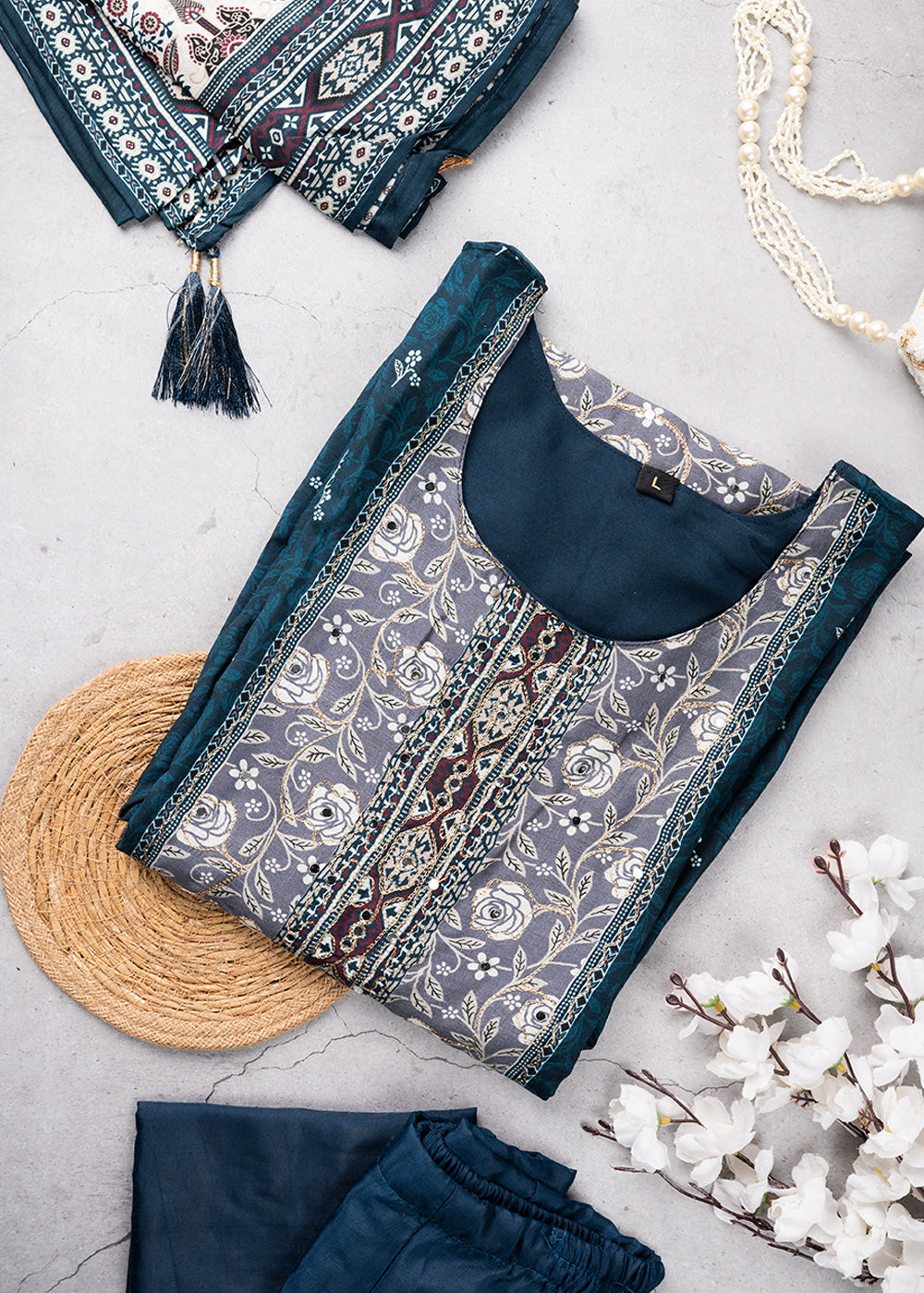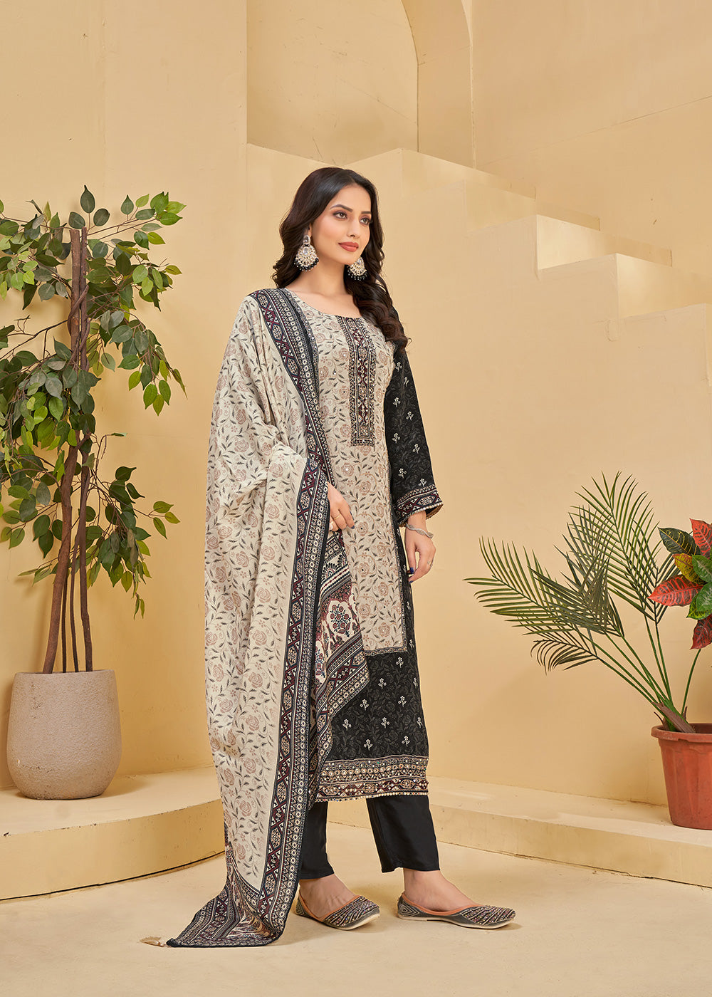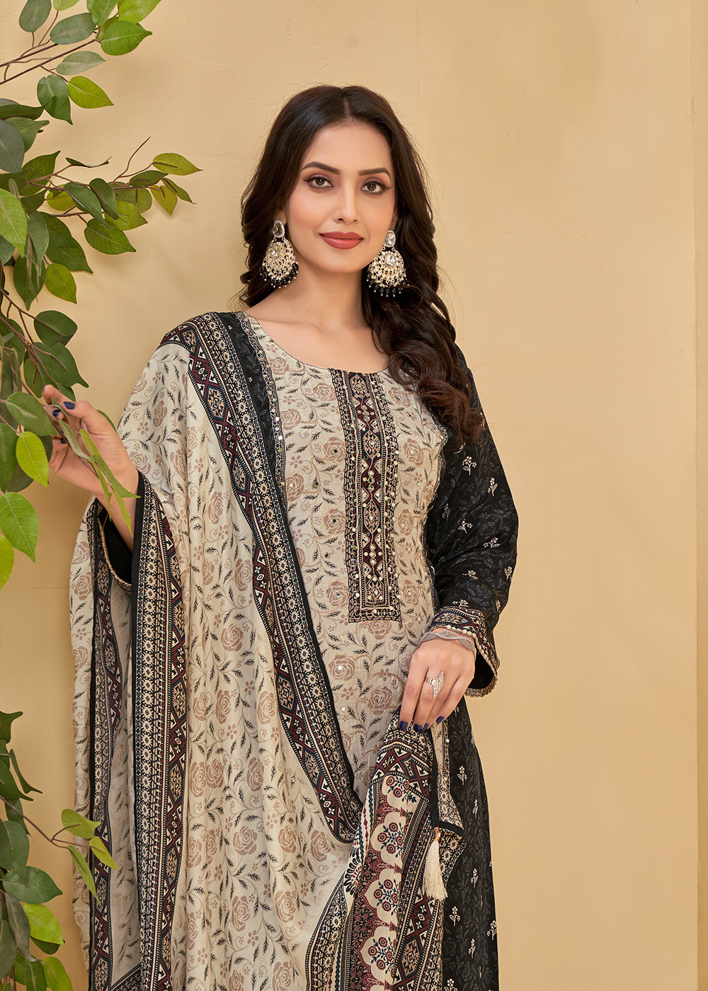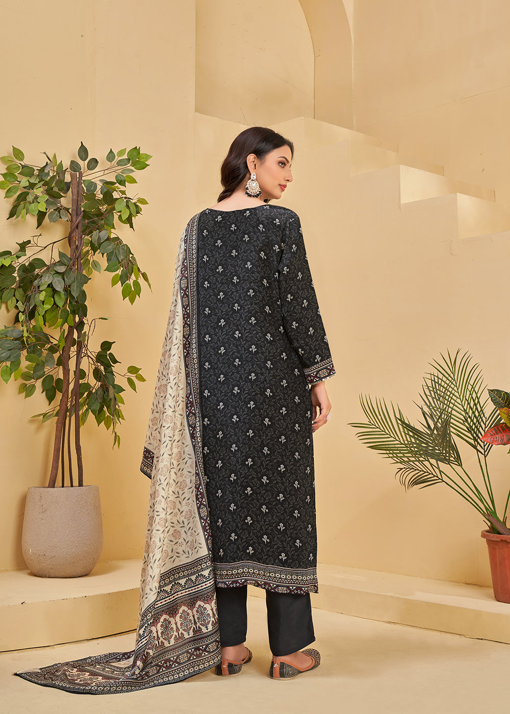 - 3 piece suit for party wear in the color Black with Digital print work and additional hand and mirror work.